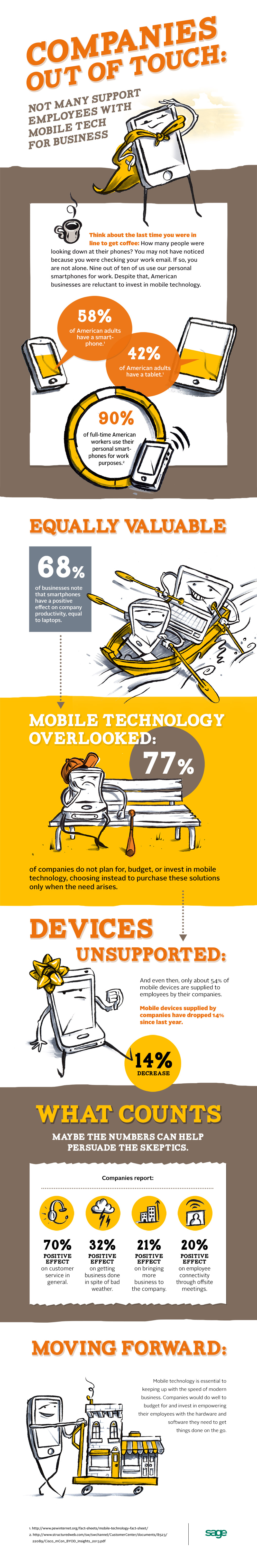 More businesses are finding it beneficial to be mobile. In fact 68% of businesses Sage surveyed found smartphones have a positive effect on company productivity, equal to laptops. What’s more surprising is that 90% of businesses we surveyed indicated employees provided their own smartphones to do company work.